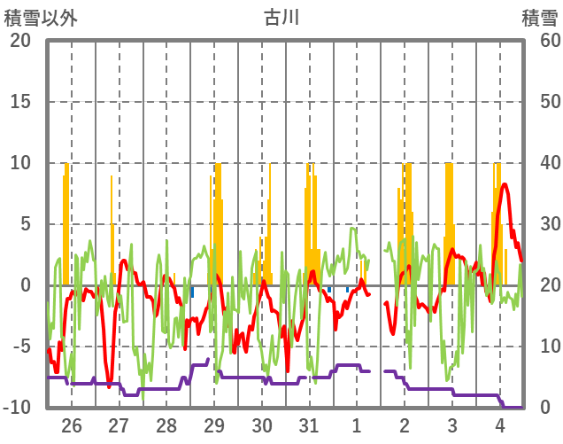 | 日 | 時 | 気温 | 降水 | 風向/風速 | 日照 | 積雪 | 降雪 |