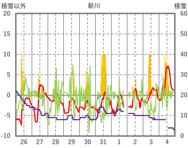 | 日 | 時 | 気温 | 降水 | 風向/風速 | 日照 | 積雪 | 降雪 |