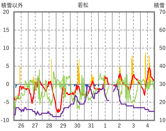 | 日 | 時 | 気温 | 降水 | 風向/風速 | 日照 | 積雪 | 降雪 |