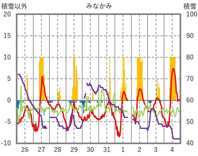 | 日 | 時 | 気温 | 降水 | 風向/風速 | 日照 | 積雪 | 降雪 |