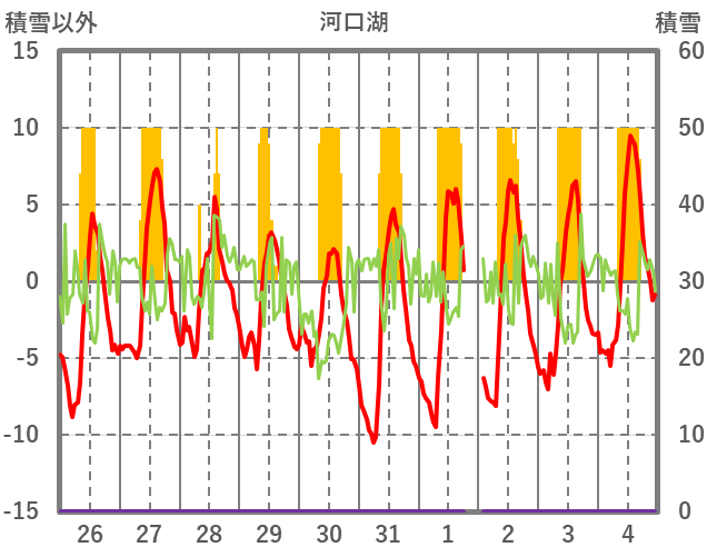 | 日 | 時 | 気温 | 降水 | 風向/風速 | 日照 | 積雪 | 降雪 |