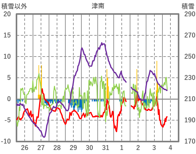 | 日 | 時 | 気温 | 降水 | 風向/風速 | 日照 | 積雪 | 降雪 |
