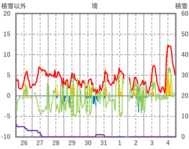 | 日 | 時 | 気温 | 降水 | 風向/風速 | 日照 | 積雪 | 降雪 |