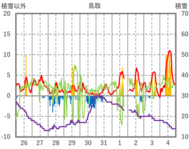 | 日 | 時 | 気温 | 降水 | 風向/風速 | 日照 | 積雪 | 降雪 |