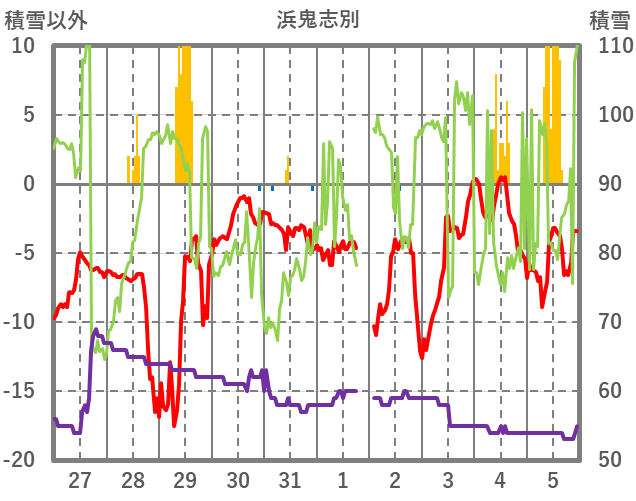 | 日 | 時 | 気温 | 降水 | 風向/風速 | 日照 | 積雪 | 降雪 |