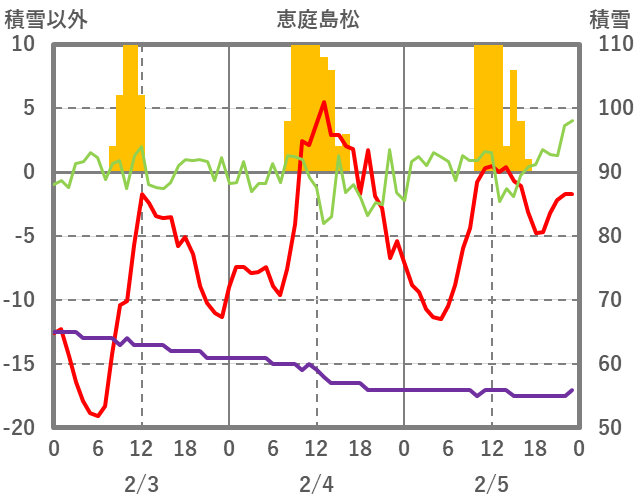 | 日 | 時 | 気温 | 降水 | 風向/風速 | 日照 | 積雪 | 降雪 |