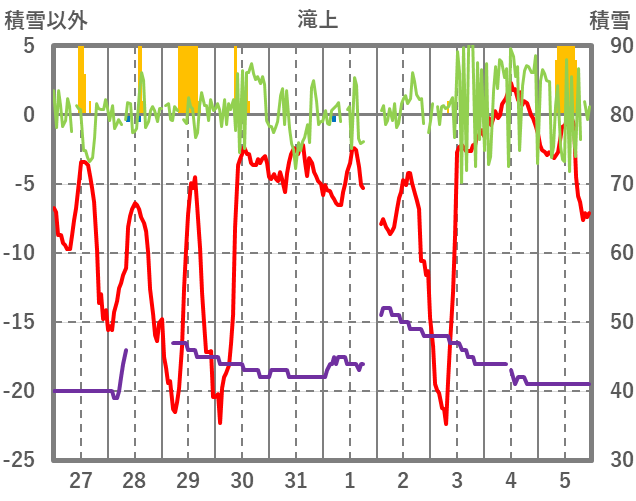 | 日 | 時 | 気温 | 降水 | 風向/風速 | 日照 | 積雪 | 降雪 |