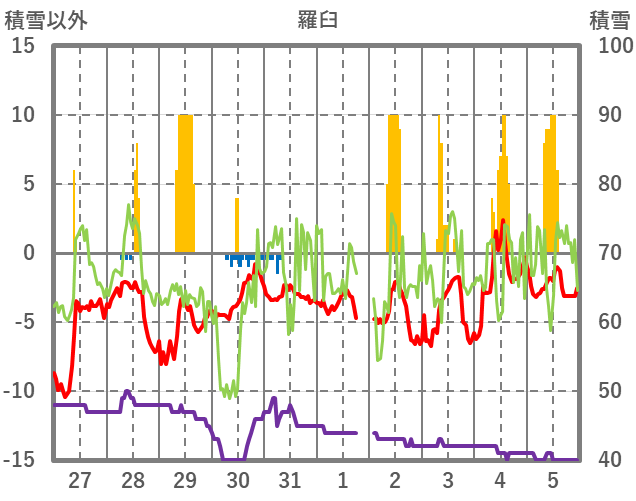 | 日 | 時 | 気温 | 降水 | 風向/風速 | 日照 | 積雪 | 降雪 |