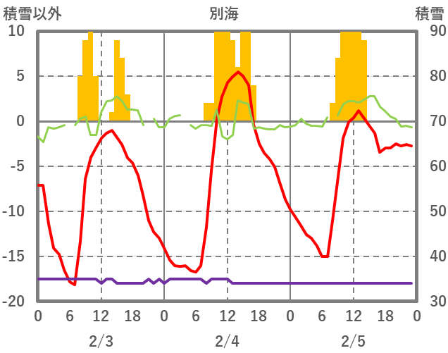 | 日 | 時 | 気温 | 降水 | 風向/風速 | 日照 | 積雪 | 降雪 |
