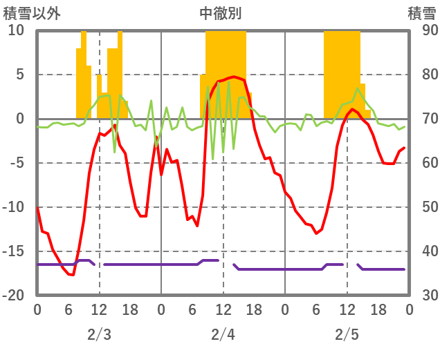 | 日 | 時 | 気温 | 降水 | 風向/風速 | 日照 | 積雪 | 降雪 |