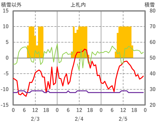 | 日 | 時 | 気温 | 降水 | 風向/風速 | 日照 | 積雪 | 降雪 |