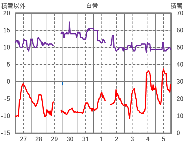 | 日 | 時 | 気温 | 降水 | 風向/風速 | 日照 | 積雪 | 降雪 |