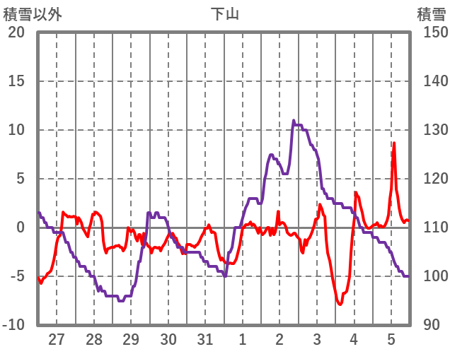 | 日 | 時 | 気温 | 降水 | 風向/風速 | 日照 | 積雪 | 降雪 |