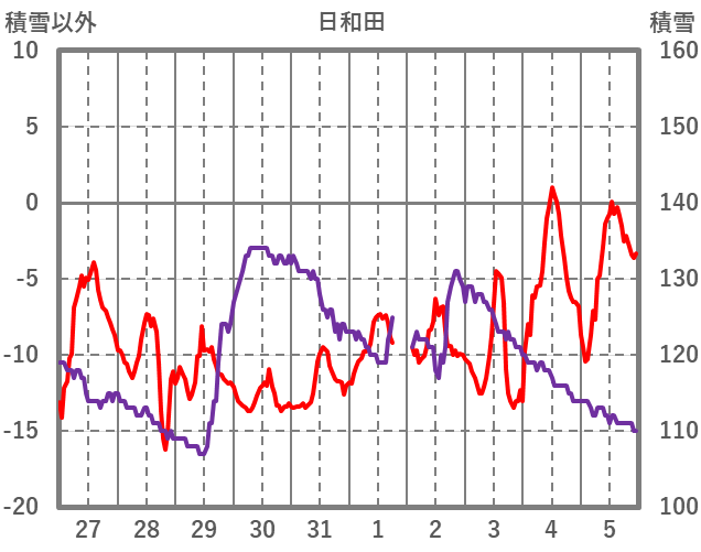 | 日 | 時 | 気温 | 降水 | 風向/風速 | 日照 | 積雪 | 降雪 |