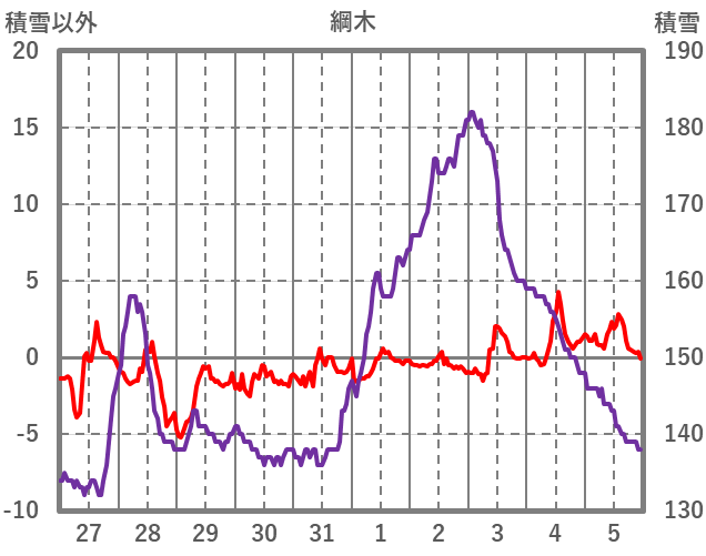 | 日 | 時 | 気温 | 降水 | 風向/風速 | 日照 | 積雪 | 降雪 |