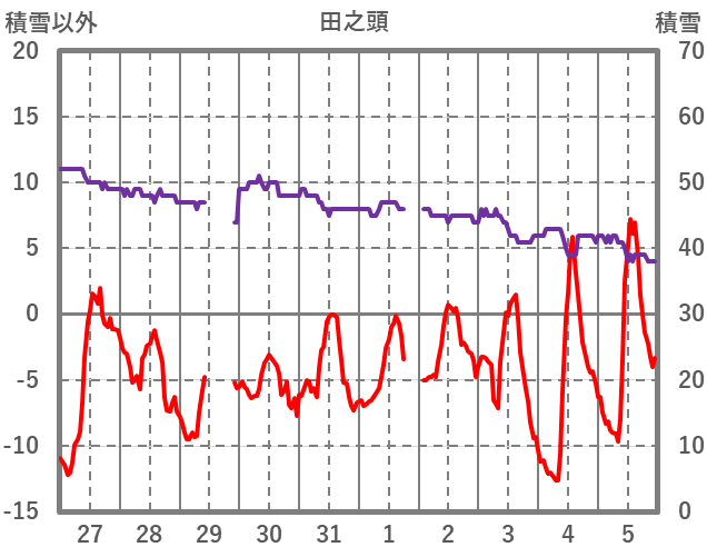 | 日 | 時 | 気温 | 降水 | 風向/風速 | 日照 | 積雪 | 降雪 |