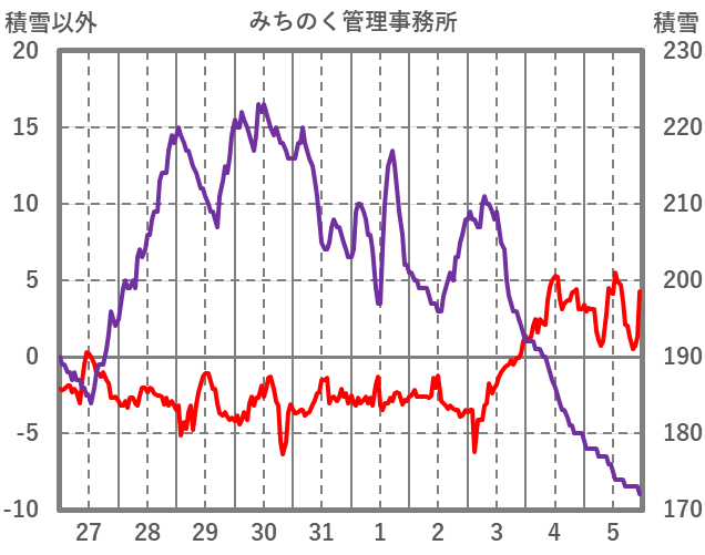 | 日 | 時 | 気温 | 降水 | 風向/風速 | 日照 | 積雪 | 降雪 |