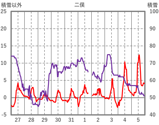 | 日 | 時 | 気温 | 降水 | 風向/風速 | 日照 | 積雪 | 降雪 |
