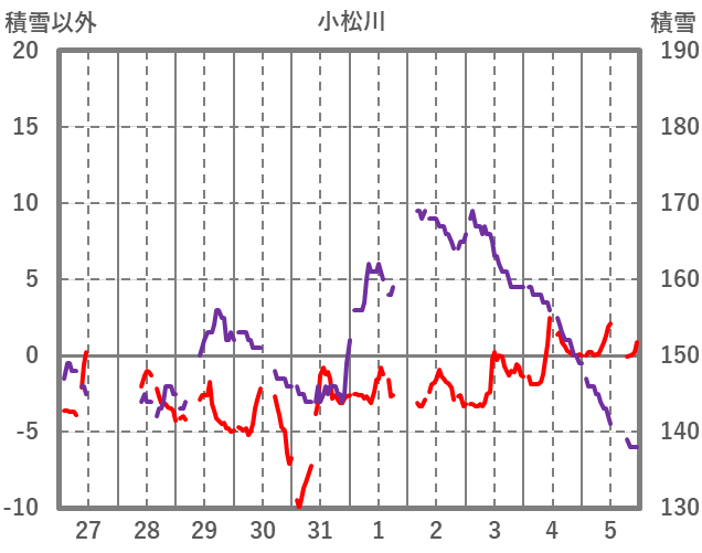 | 日 | 時 | 気温 | 降水 | 風向/風速 | 日照 | 積雪 | 降雪 |