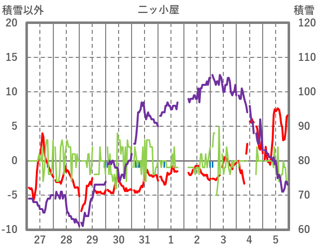 | 日 | 時 | 気温 | 降水 | 風向/風速 | 日照 | 積雪 | 降雪 |