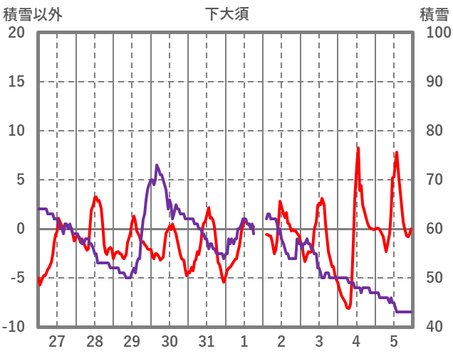 | 日 | 時 | 気温 | 降水 | 風向/風速 | 日照 | 積雪 | 降雪 |
