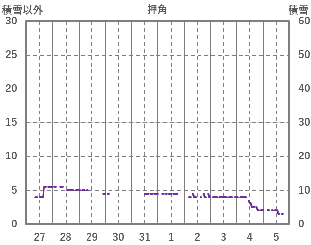 | 日 | 時 | 気温 | 降水 | 風向/風速 | 日照 | 積雪 | 降雪 |