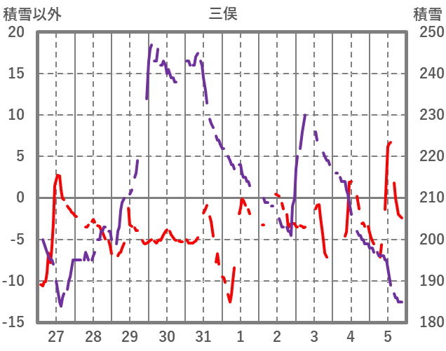 | 日 | 時 | 気温 | 降水 | 風向/風速 | 日照 | 積雪 | 降雪 |