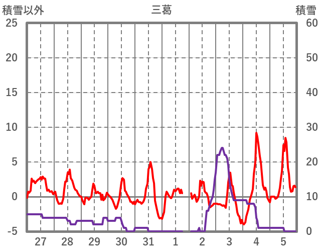 | 日 | 時 | 気温 | 降水 | 風向/風速 | 日照 | 積雪 | 降雪 |
