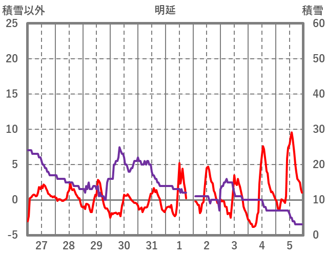 | 日 | 時 | 気温 | 降水 | 風向/風速 | 日照 | 積雪 | 降雪 |