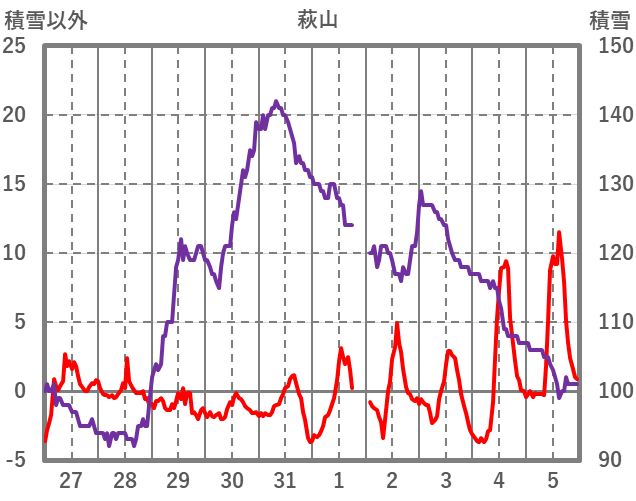 | 日 | 時 | 気温 | 降水 | 風向/風速 | 日照 | 積雪 | 降雪 |