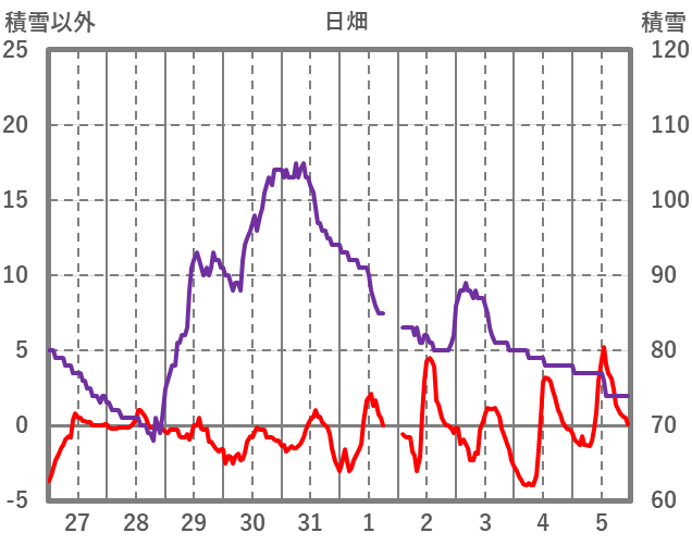 | 日 | 時 | 気温 | 降水 | 風向/風速 | 日照 | 積雪 | 降雪 |