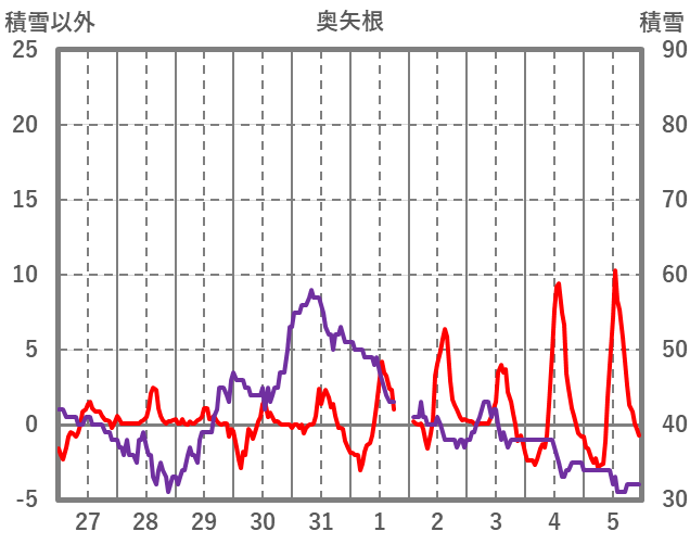 | 日 | 時 | 気温 | 降水 | 風向/風速 | 日照 | 積雪 | 降雪 |
