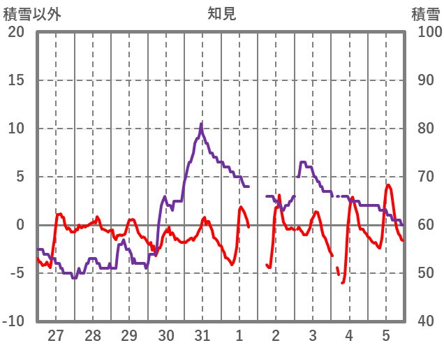 | 日 | 時 | 気温 | 降水 | 風向/風速 | 日照 | 積雪 | 降雪 |