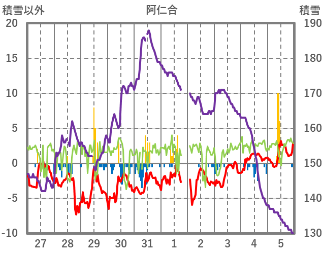 | 日 | 時 | 気温 | 降水 | 風向/風速 | 日照 | 積雪 | 降雪 |