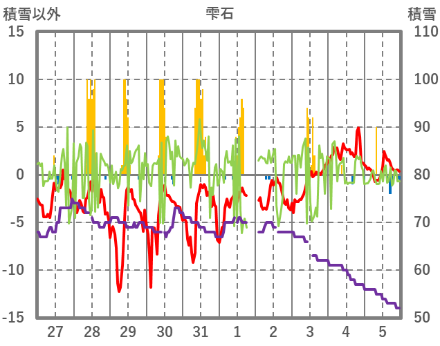 | 日 | 時 | 気温 | 降水 | 風向/風速 | 日照 | 積雪 | 降雪 |
