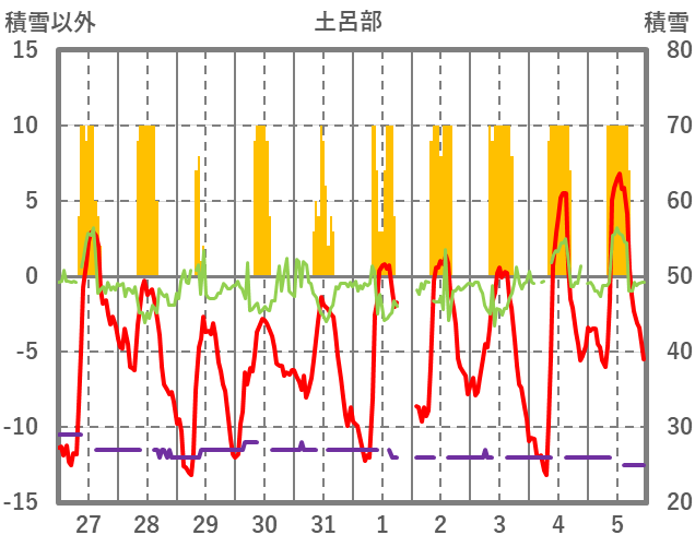 | 日 | 時 | 気温 | 降水 | 風向/風速 | 日照 | 積雪 | 降雪 |
