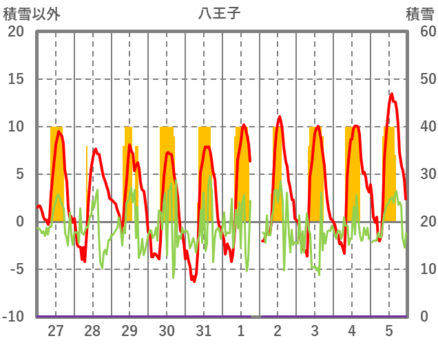 | 日 | 時 | 気温 | 降水 | 風向/風速 | 日照 | 積雪 | 降雪 |