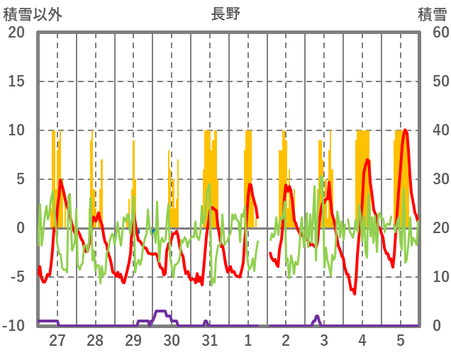 | 日 | 時 | 気温 | 降水 | 風向/風速 | 日照 | 積雪 | 降雪 |
