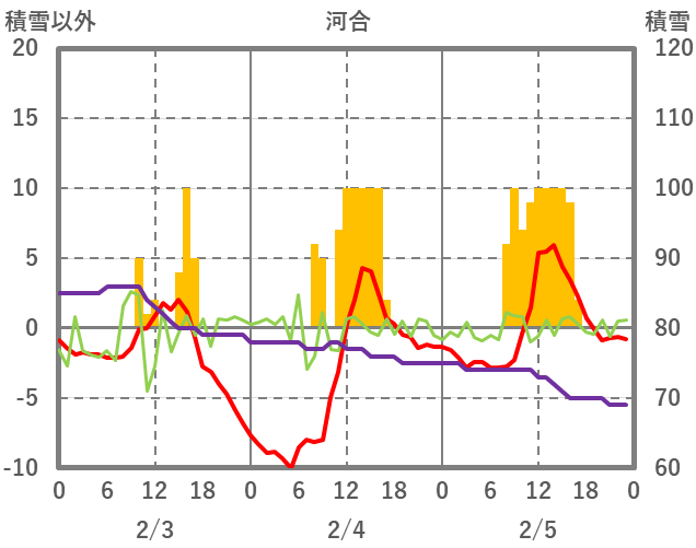 | 日 | 時 | 気温 | 降水 | 風向/風速 | 日照 | 積雪 | 降雪 |