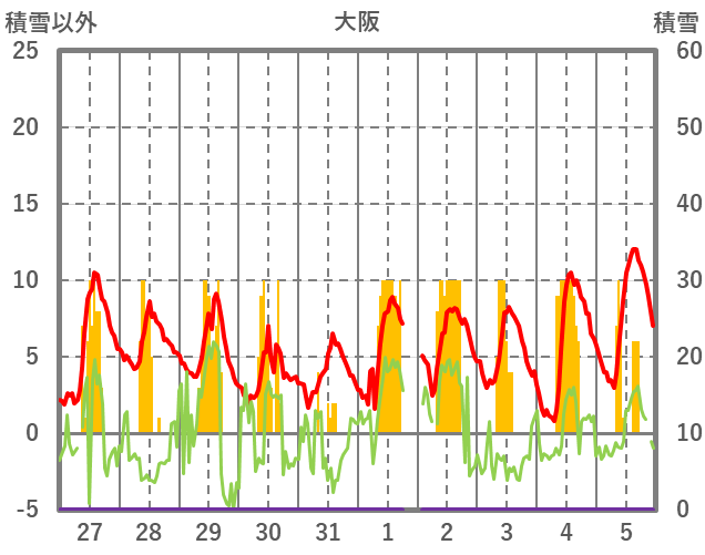 | 日 | 時 | 気温 | 降水 | 風向/風速 | 日照 | 積雪 | 降雪 |