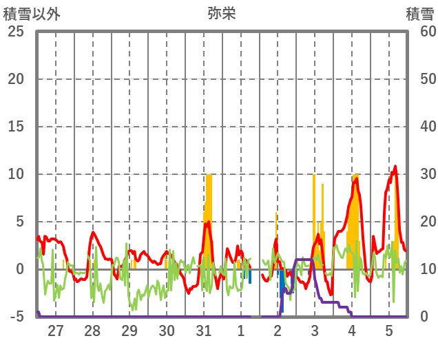 | 日 | 時 | 気温 | 降水 | 風向/風速 | 日照 | 積雪 | 降雪 |