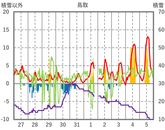 | 日 | 時 | 気温 | 降水 | 風向/風速 | 日照 | 積雪 | 降雪 |