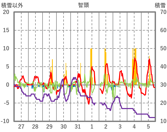 | 日 | 時 | 気温 | 降水 | 風向/風速 | 日照 | 積雪 | 降雪 |