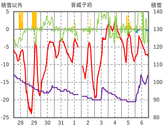 | 日 | 時 | 気温 | 降水 | 風向/風速 | 日照 | 積雪 | 降雪 |