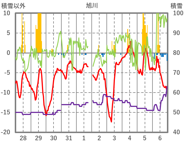 | 日 | 時 | 気温 | 降水 | 風向/風速 | 日照 | 積雪 | 降雪 |
