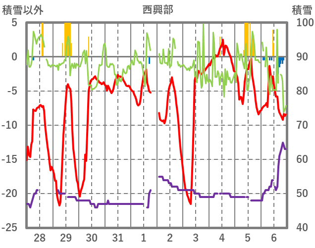 | 日 | 時 | 気温 | 降水 | 風向/風速 | 日照 | 積雪 | 降雪 |