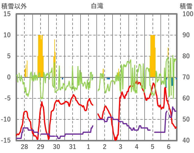 | 日 | 時 | 気温 | 降水 | 風向/風速 | 日照 | 積雪 | 降雪 |