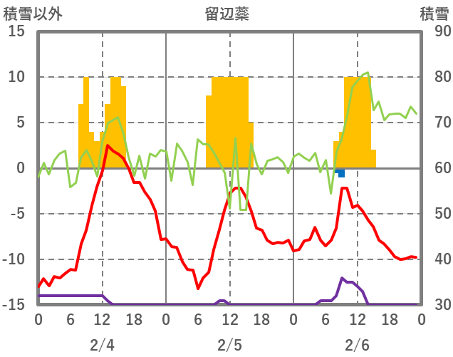 | 日 | 時 | 気温 | 降水 | 風向/風速 | 日照 | 積雪 | 降雪 |