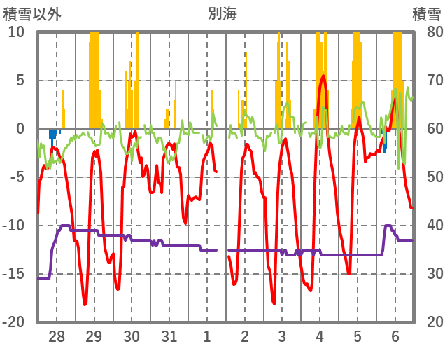 | 日 | 時 | 気温 | 降水 | 風向/風速 | 日照 | 積雪 | 降雪 |