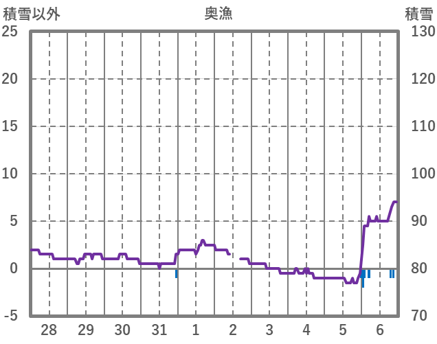 | 日 | 時 | 気温 | 降水 | 風向/風速 | 日照 | 積雪 | 降雪 |